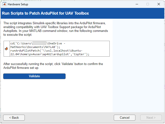 After cloning the scripts, the Run Scripts to Patch ArduPilot for UAV Toolbox screen is displayed. To proceed, run the provided commands in your MATLAB command window to patch the ArduPilot firmware for UAV Toolbox compatibility and then click Validate.