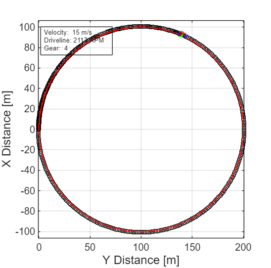 3. Run the maneuver with the default settings. As the simulation runs, view the vehicle information.