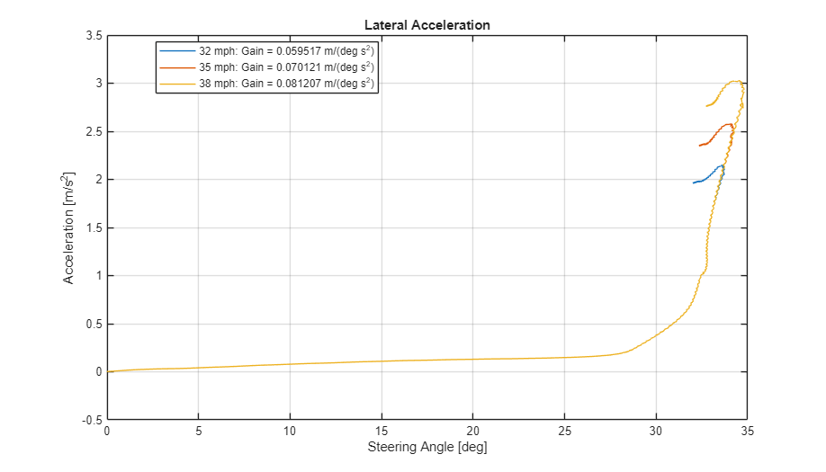 The results are similar to these plots, which indicate that the greatest lateral acceleration occurs when the vehicle velocity is 45 mph.