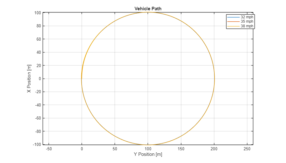 This example shows how to use the vehicle dynamics constant radius reference application to analyze the impact of speed on the vehicle lateral dynamics. Specifically, you can examine the lateral acceleration when you run the maneuver with different speeds. For information about similar maneuvers, see standards SAE J266_199601 and ISO 4138:2012.