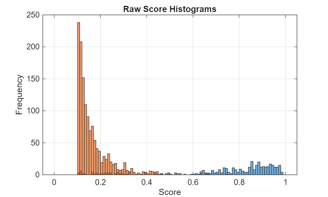 histBins = [0:0.01:1]; figure; histogram(positiveScores,histBins) hold on; histogram(negativeScores,histBins) title("Raw Score Histograms") xlabel("Score") ylabel("Frequency") grid on
