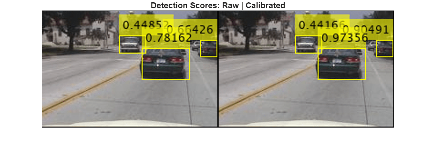 imgIdx =130; img = readimage(imds,imgIdx); [boxes, scores, labels] = detect(detector, img, Threshold=0.4); % Calibrate the raw scores using the Platt scaling logistic regression calibratedScores = mdl.predict(scores); imRaw = insertObjectAnnotation(img, "rectangle", boxes, string(scores)); imCalib = insertObjectAnnotation(img, "rectangle", boxes, string(calibratedScores)); figure; montage({imRaw, imCalib}, BorderSize=[1 2]) title( "Detection Scores: Raw | Calibrated") truesize