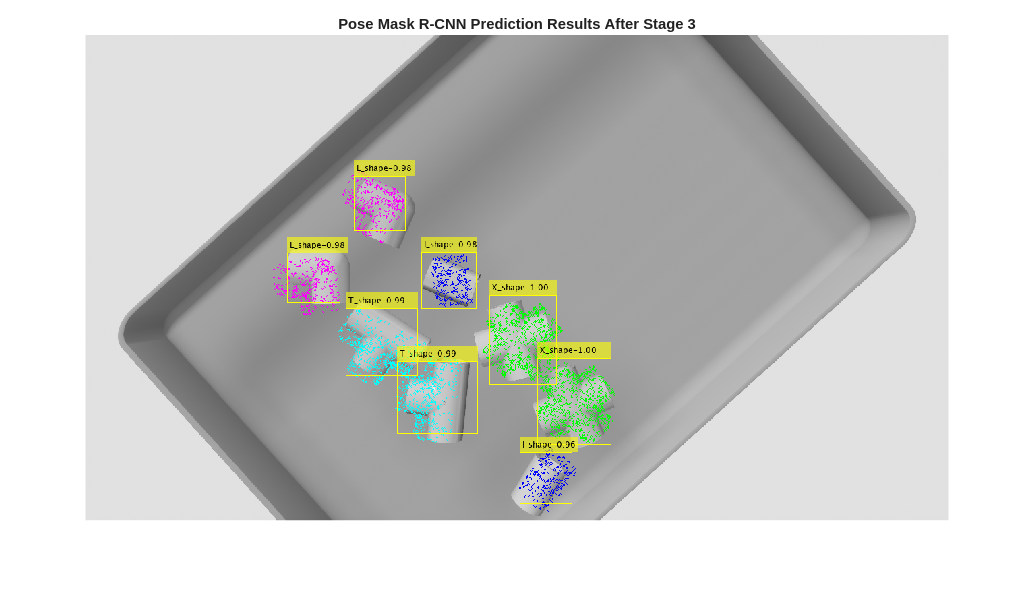 Perform transfer learning on a custom bin-picking data set using the Pose Mask R-CNN deep learning network. The data set contains 100 RGB images and depth images of 3-D pipe connectors, generated using Simulink®. The data consists of images of these machine parts lying at random orientations inside a bin, viewed from different angles and under different lighting conditions, and contains four object classes that correspond to objects having I, X, L, or T shapes. The data set additionally contains bounding boxes, object classes, binary masks, and 6-DoF pose information for every object in each image, as well as point cloud data for each of the four object classes.
