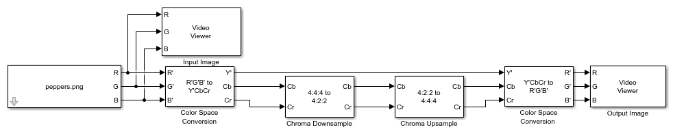 Run the model. The Chroma Resampling blocks downsamples the chrominance components from a size of 384-by-512 pixels to a size of 384-by-256 pixels, and then upsamples them back to a size of 384-by-512 pixels. The model displays the original input image and the resampled output image by using Video Viewer blocks.