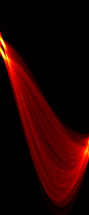 By transforming the binary image into the Hough parameter space, the example determines the theta and rho values of the lines created by the Smudge text subsystem. Once the theta values of the text lines are known, the example uses the Rotate block to eliminate the large angular variations.