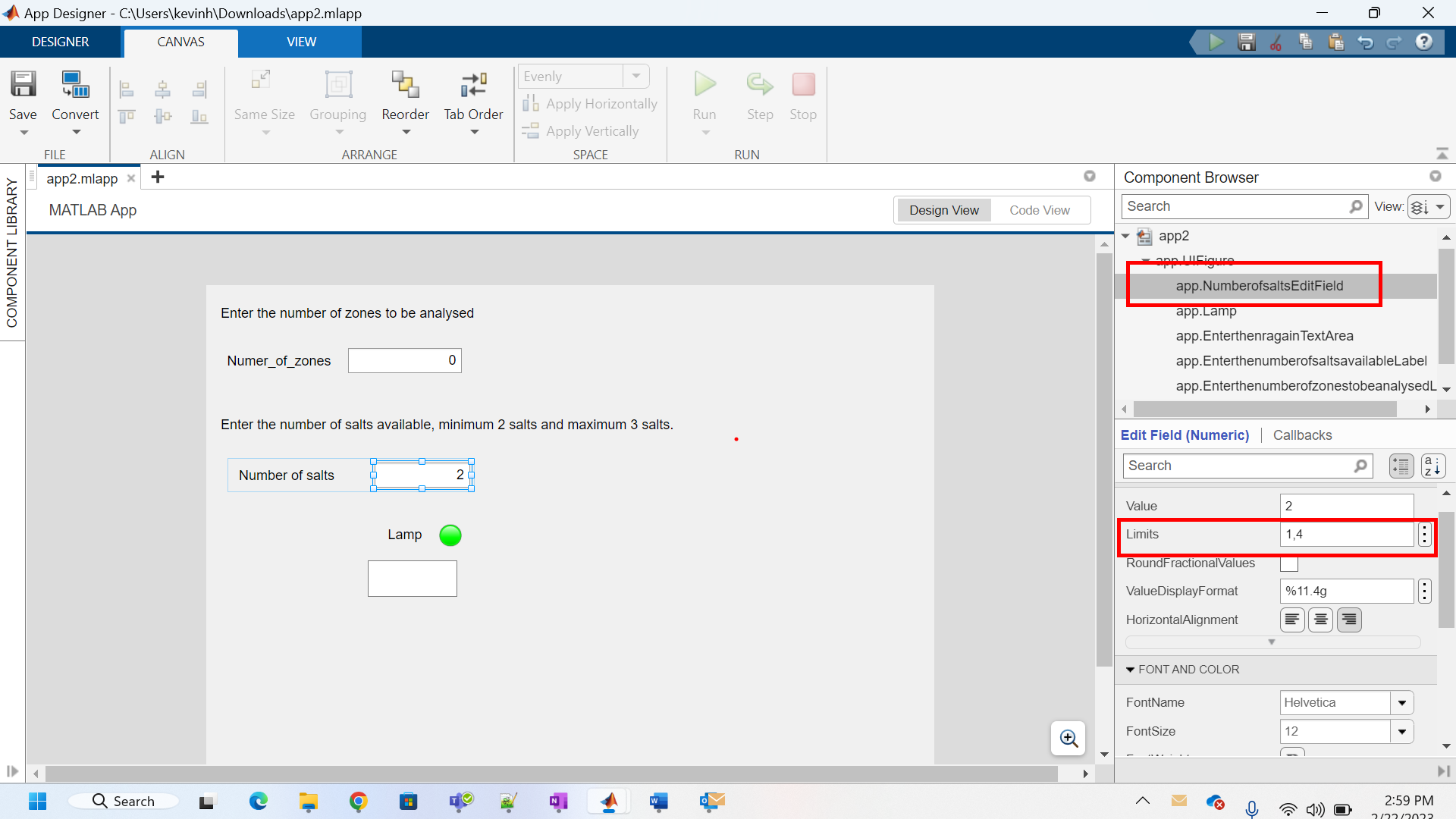 But I am failing to understand why I dont get changed the color of the lamp when the number of salts entered is greater than 3 or less than 2, this is the criterion I have coded for the lamp to change color.