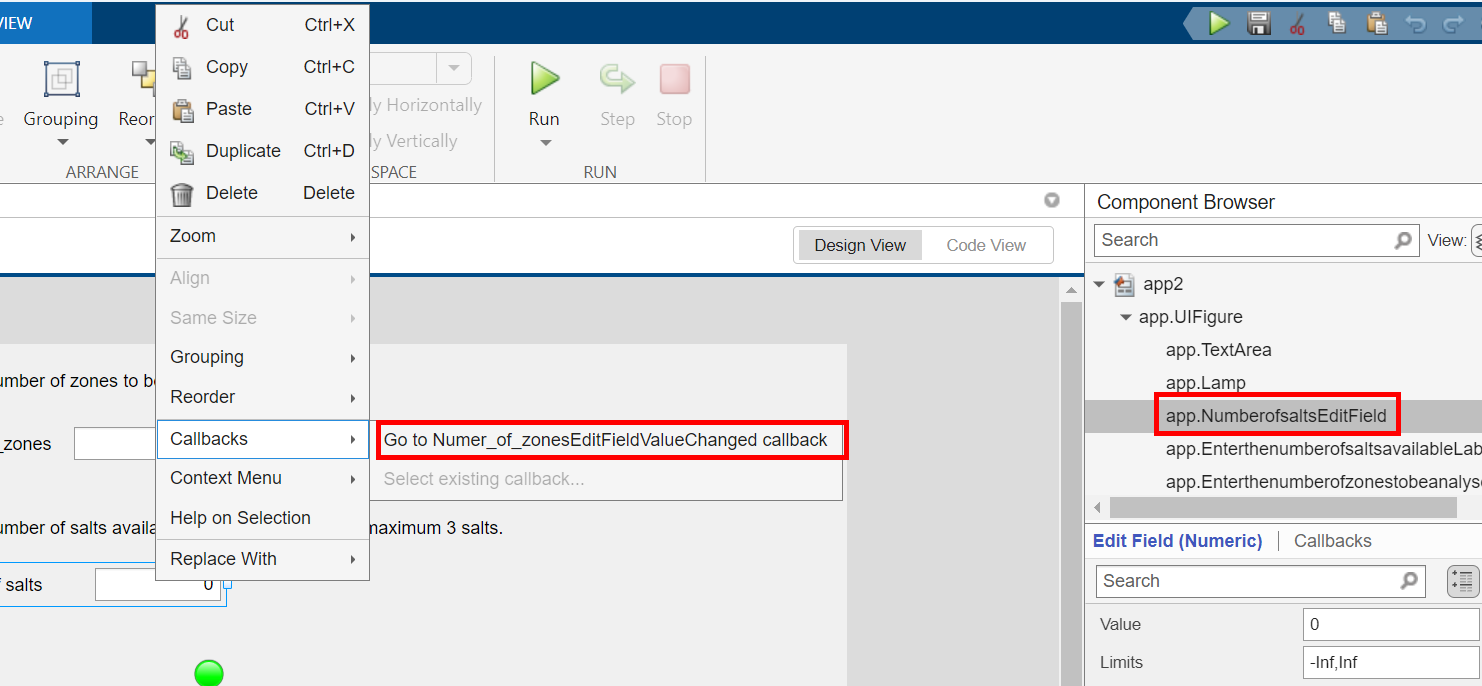 Try starting with a simpler app, say an app with one NumericEditField and one lamp. In that app, get the lamp to change color based on the Value of the NumericEditField. Then build up from there to where you want to go, verifying that each incremental change you make works as you expect.